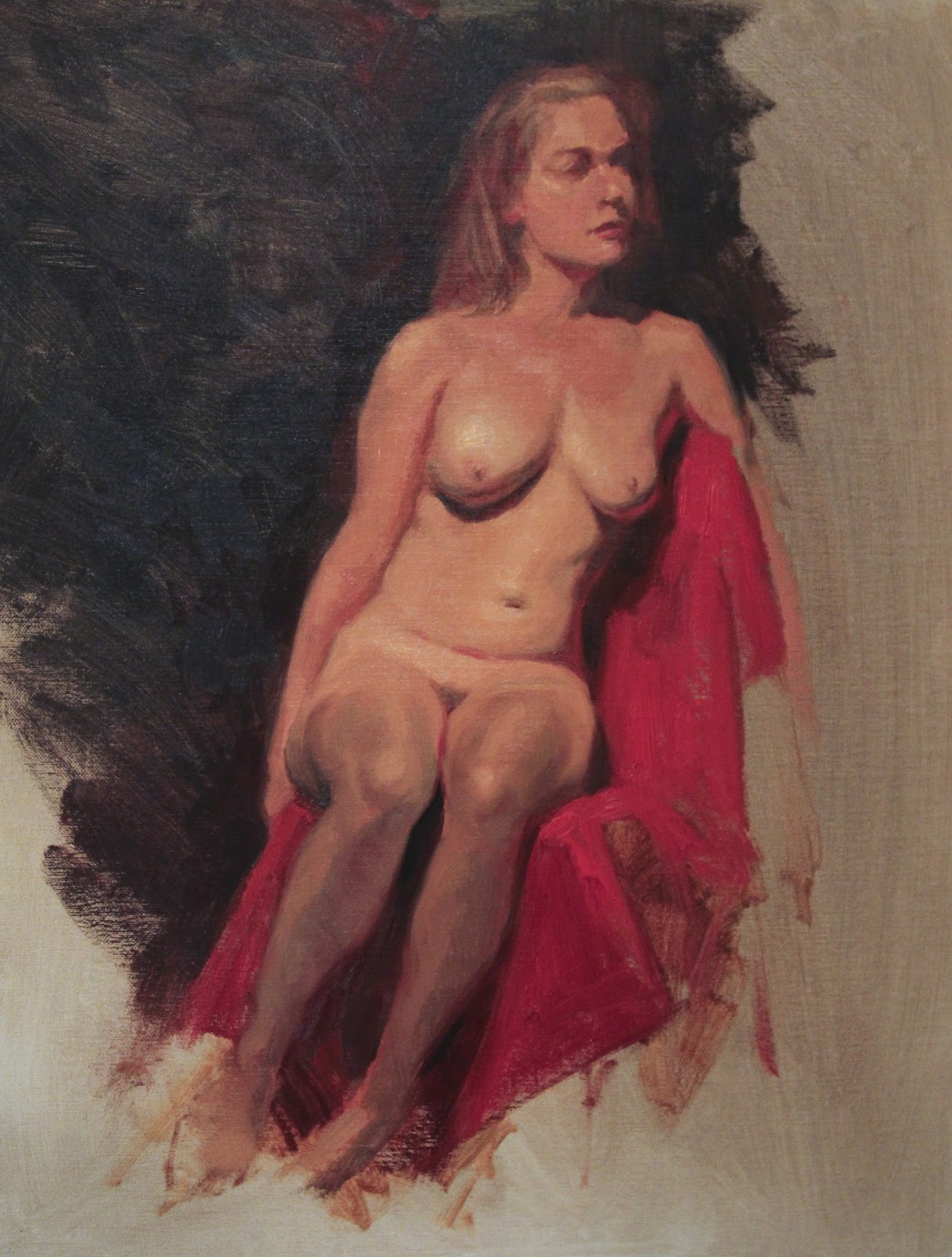 Below: my painting from the afternoon session. I really enjoyed working with our gorgeous model, Chelsey. She has been the muse for several of Jeremy Lipking and Alexey Steele's paintings, and I never thought I'd get to paint her! Dan suggested that I set up on the sidelines for a profile view. At first I resisted, having done a profile the day before. But when I saw how beautiful the light was on Chelsey, I immediately set up there and started working. I painted with more freedom and panache than usual on this one, thanks to Dan's inspiring demo. What fun!!